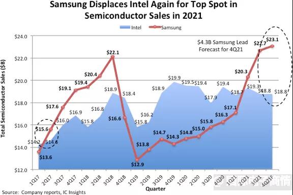 三星电子的半导体销售额预计将在2021年达到近831亿美元,使其成为今年最大的半导体供应商。在存储器市场复苏和英特尔相对持平的销售业绩的推动下,三星电子从21年第二季度开始再次取代英特尔成为领先的半导体生产商(图2)。随着DRAM市场NAND闪存市场在2021年强劲增长,预计三星2021-2020年的销售额将增长34%,今年将比排名第二的英特尔领先75亿美元。