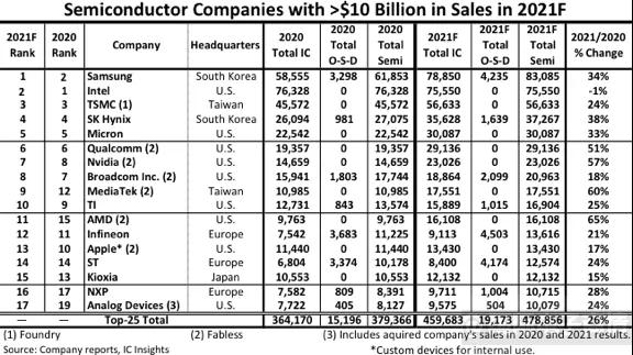 2021年预计17家半导体公司销售额超100亿美元规模